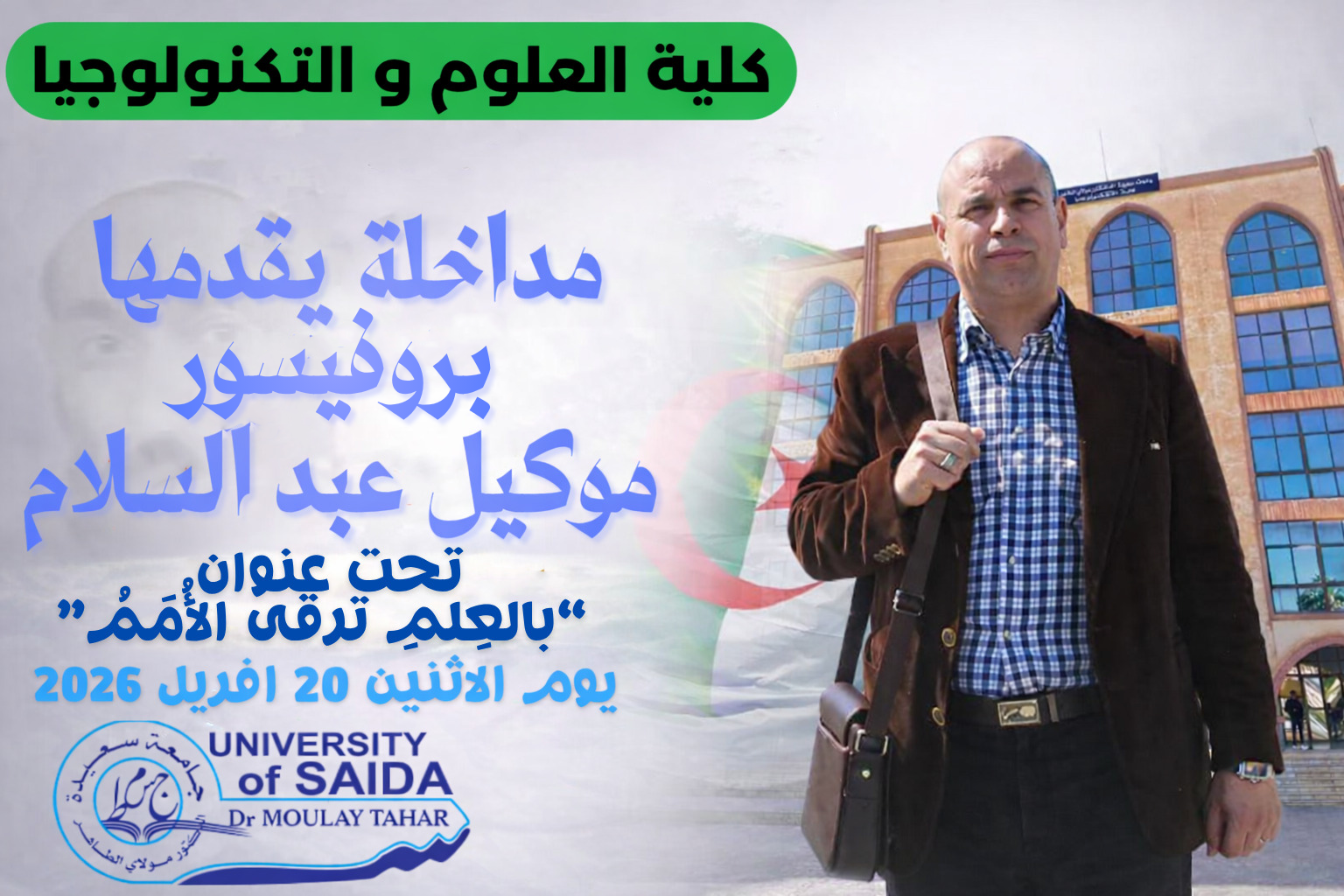 تتشرف الأسرة الجامعية بكلية العلوم والتكنولوجيا، وعلى رأسها السيدة عميدة الكلية، بدعوة جميع الطلبة والطالبات بجامعة سعيدة الدكتور مولاي الطاهر لحضور تظاهرة يوم العلم على مستوى الكلية، والتي تتضمن معرضًا لمختلف النوادي العلمية بالكليات، وتتخللها مداخلة للدكتور موكيل عبد السلام تحت عنوان: بالعِلمِ ترقى الأُمَمُ
