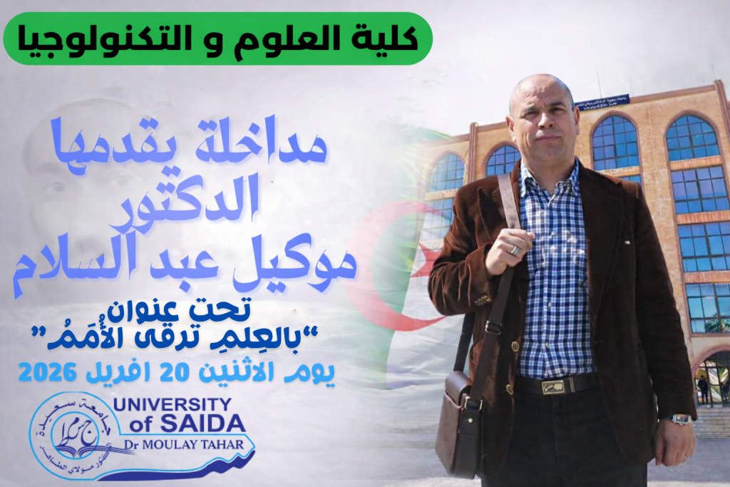 تتشرف الأسرة الجامعية بكلية العلوم والتكنولوجيا، وعلى رأسها السيدة عميدة الكلية، بدعوة جميع الطلبة والطالبات بجامعة سعيدة الدكتور مولاي الطاهر لحضور تظاهرة يوم العلم على مستوى الكلية، والتي تتضمن معرضًا لمختلف النوادي العلمية بالكليات، وتتخللها مداخلة للدكتور موكيل عبد السلام تحت عنوان: بالعِلمِ ترقى الأُمَمُ