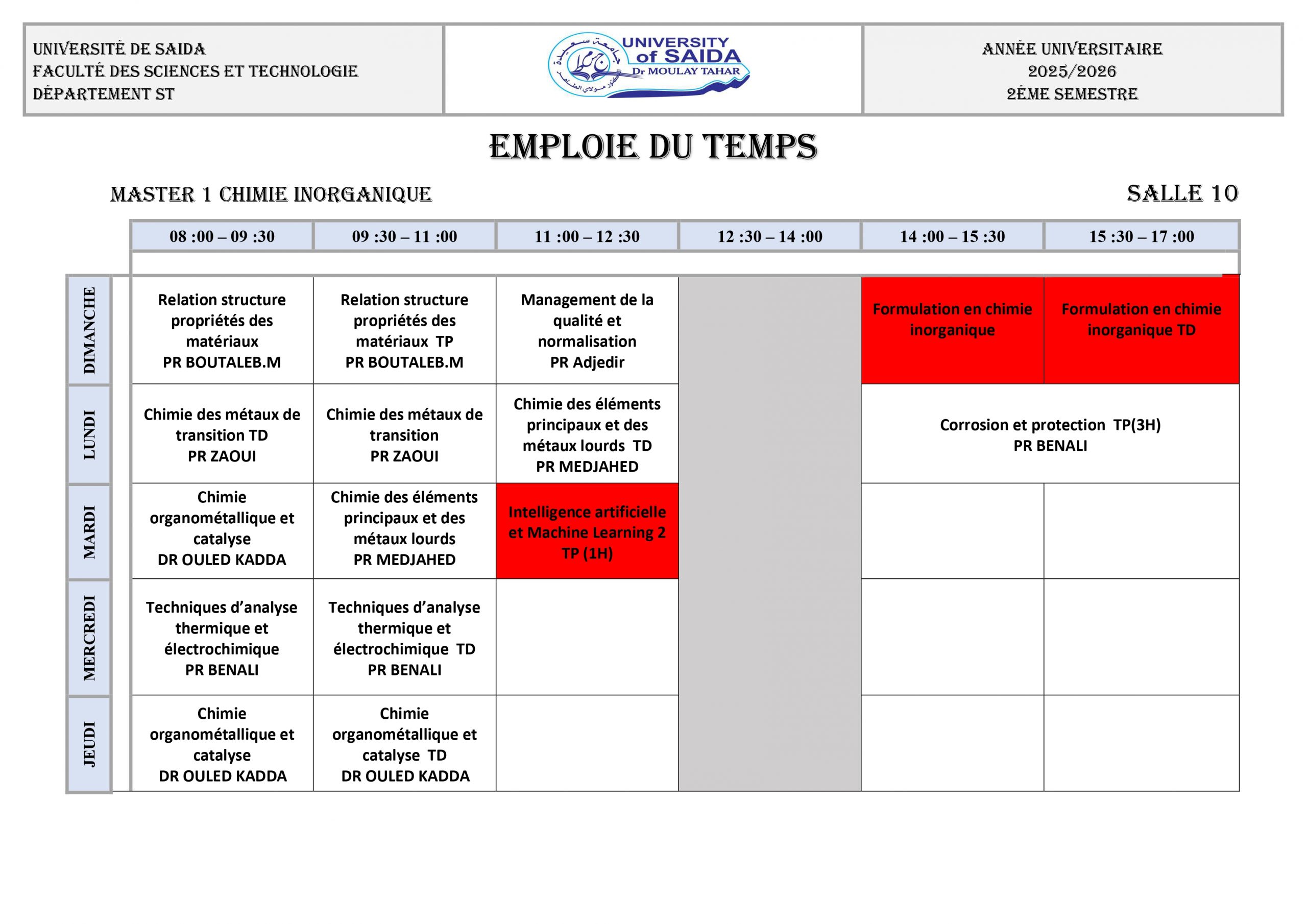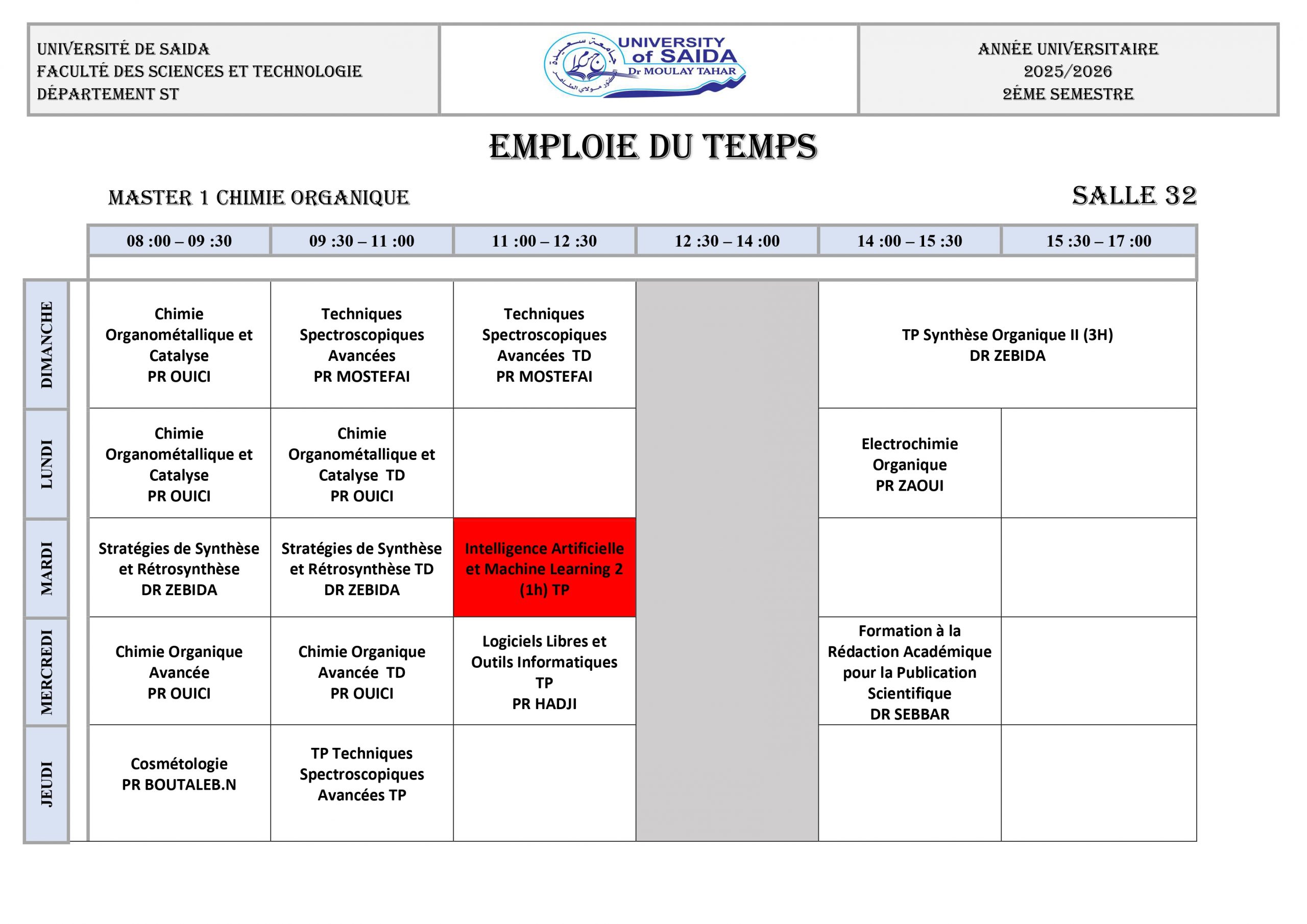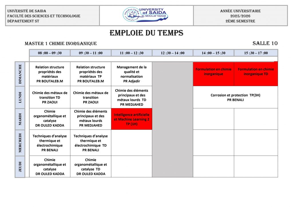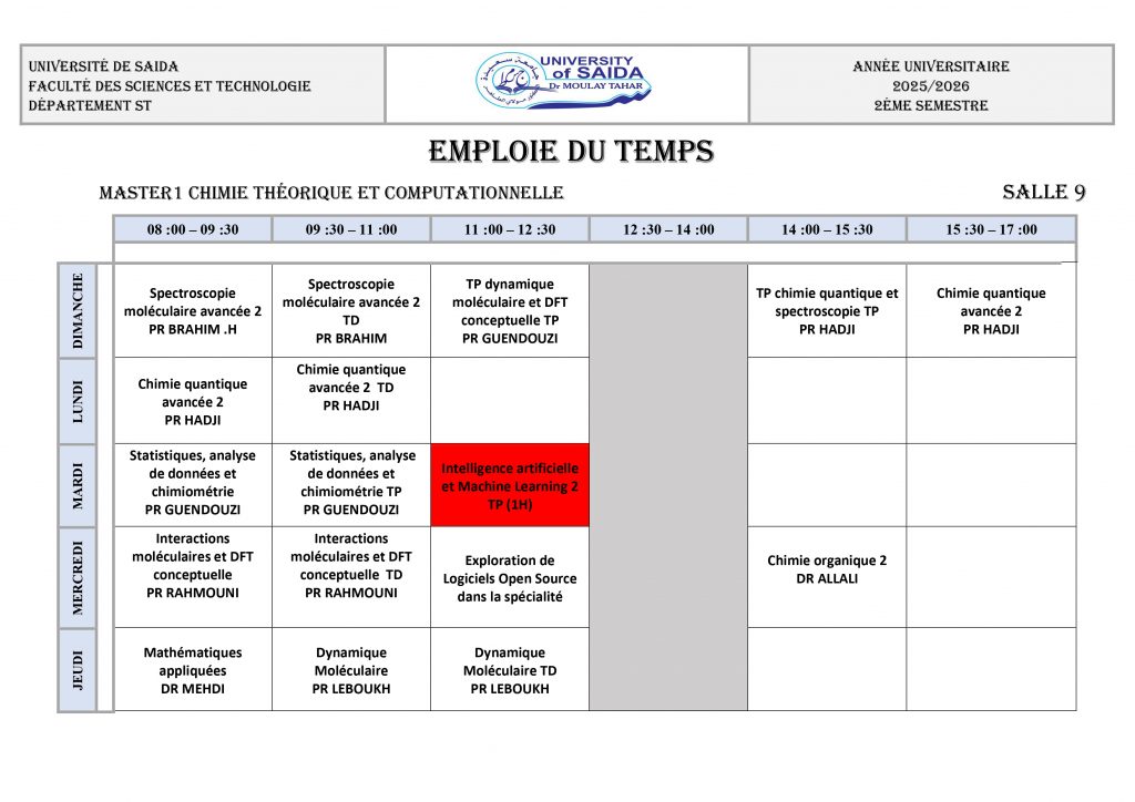 Emploi du Temps 2025/2026 M1 CHIMIE ORGANIQUE M1 CHIMIE INORGANIQUE M1 CHIMIE THÉORIQUE ET COMPUTATIONNELLE